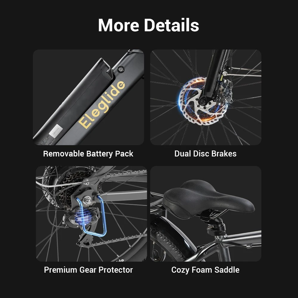 Ein LCD-Display am Lenker informiert unter anderem über die Geschwindigkeit, die zurückgelegte Entfernung und natürlich den Batteriestand. Dank dem im Rahmen integrierten und herausnehmbaren Lithium-Ionen-Akku mit 468 Wh Kapazität ist eine Reichweite von bis zu 100 km pro Ladung möglich. Somit lassen sich auch längere Touren durch die Natur problemlos mit dem Eleglide T1 bewältigen.