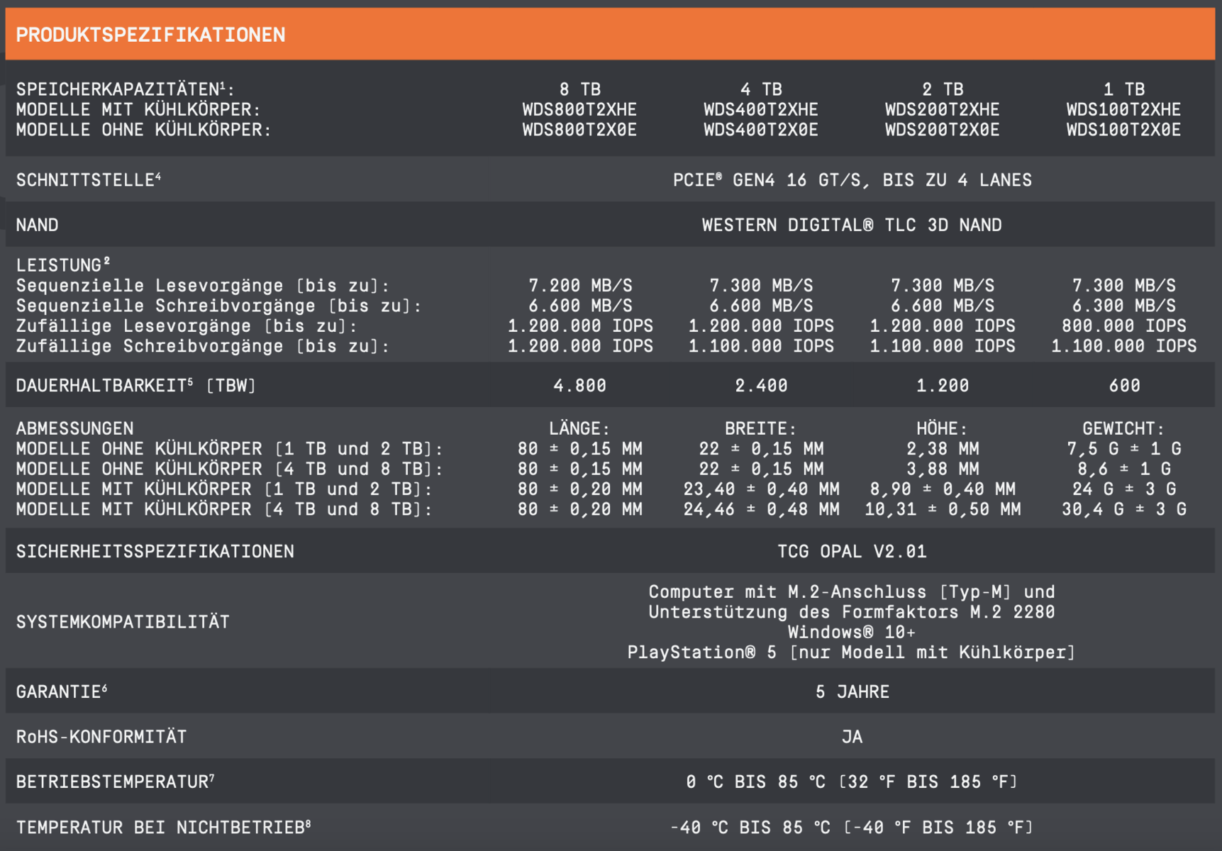 Aus technischer Sicht liefert die 8TB-Version der WD Black SN850X im Großen und Ganzen ähnliche Zahlen wie die erschwinglicheren Modelle der M.2-SSD (ab. Nur beim sequentiellen Lesen ist der 8TB-Speicher minimal langsamer und erreicht 7.200 MB/s, beim sequentiellen Schreiben sind es in der Spitze 6.600 MB/s. Auch die gewohnte fünfjährige Herstellergarantie ist im Preis enthalten, die Haltbarkeit der WD Black SN850X soll bei hohen 4.800 TBW liegen.