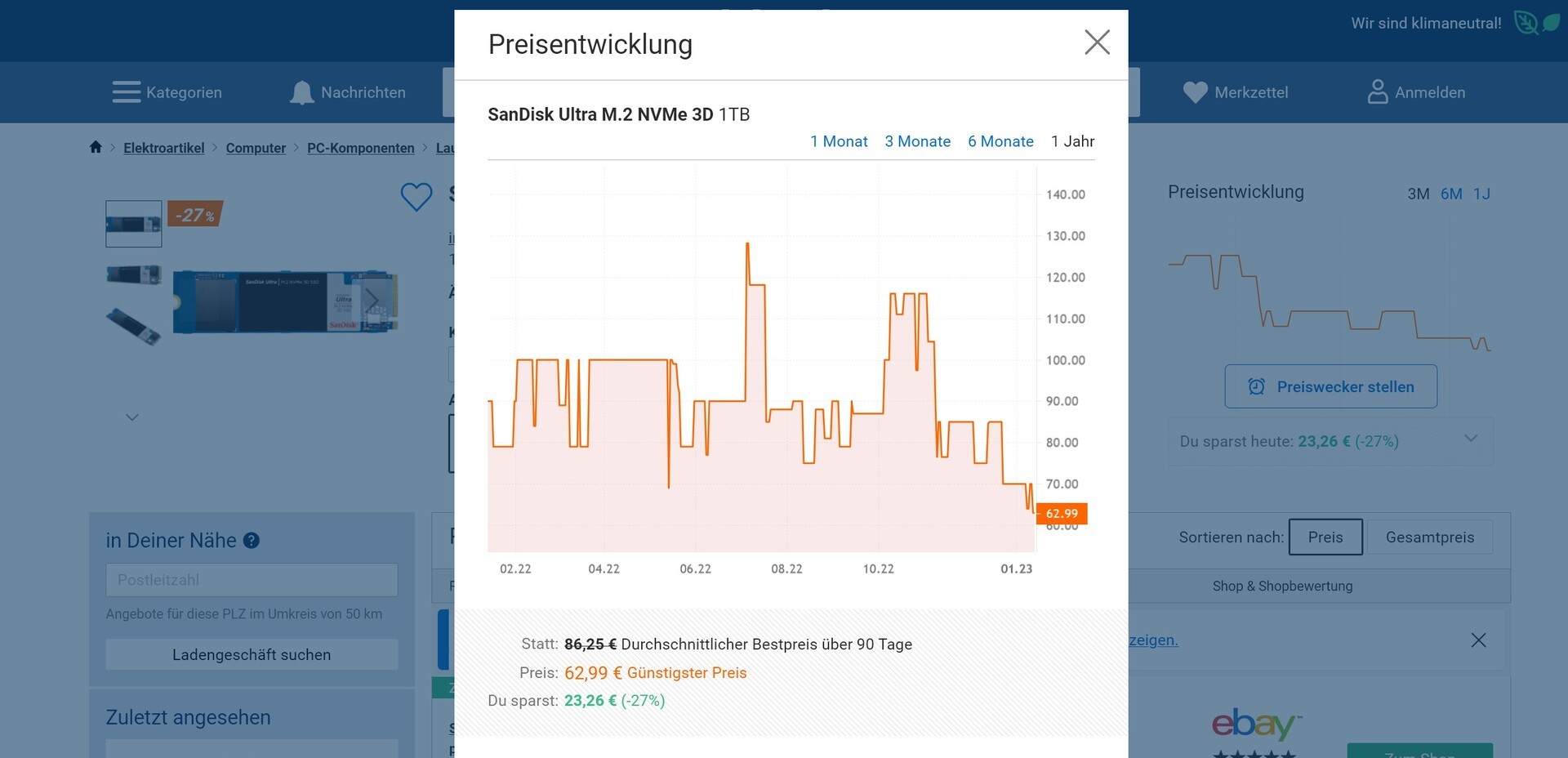 Die SanDisk Ultra 3D mit 1 Terabyte SSD-Speicher ist ein Klon der beliebten WD Blue SN570 und gibt es derzeit zum Tiefstpreis von nur 63 Euro. Laut dem Preisvergleichs-Dienst Idealo gab es die Sandisk SSD bisher nie günstiger. Um auf den Preis zu kommen, gibt man an der Kasse den Gutschein-Code "LEVELUP23" ein.