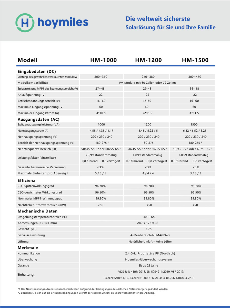 Der Hoymiles-Wechselrichter-HM-1500 für Photovoltaik-Anlagen hat einen Spitzenwirkungsgrad von 96,7 Prozent, sodass die Umwandlung von Gleichstrom in Wechselstrom ohne große Verluste erfolgt. Solarpanele einer Anlage funktionieren zu keiner Tageszeit unter identischen Bedingungen - beim Hoymiles-HM-1500 handelt es sich um einen Mikrowechselrichter, der sicherstellen soll, dass alle Module jederzeit auf einem optimalen Leistungsniveau funktionieren. Auf diese Weise können maximale Stromerträge gewonnen und die Unabhängigkeit von fossilen Brennstoffen erhöht werden.