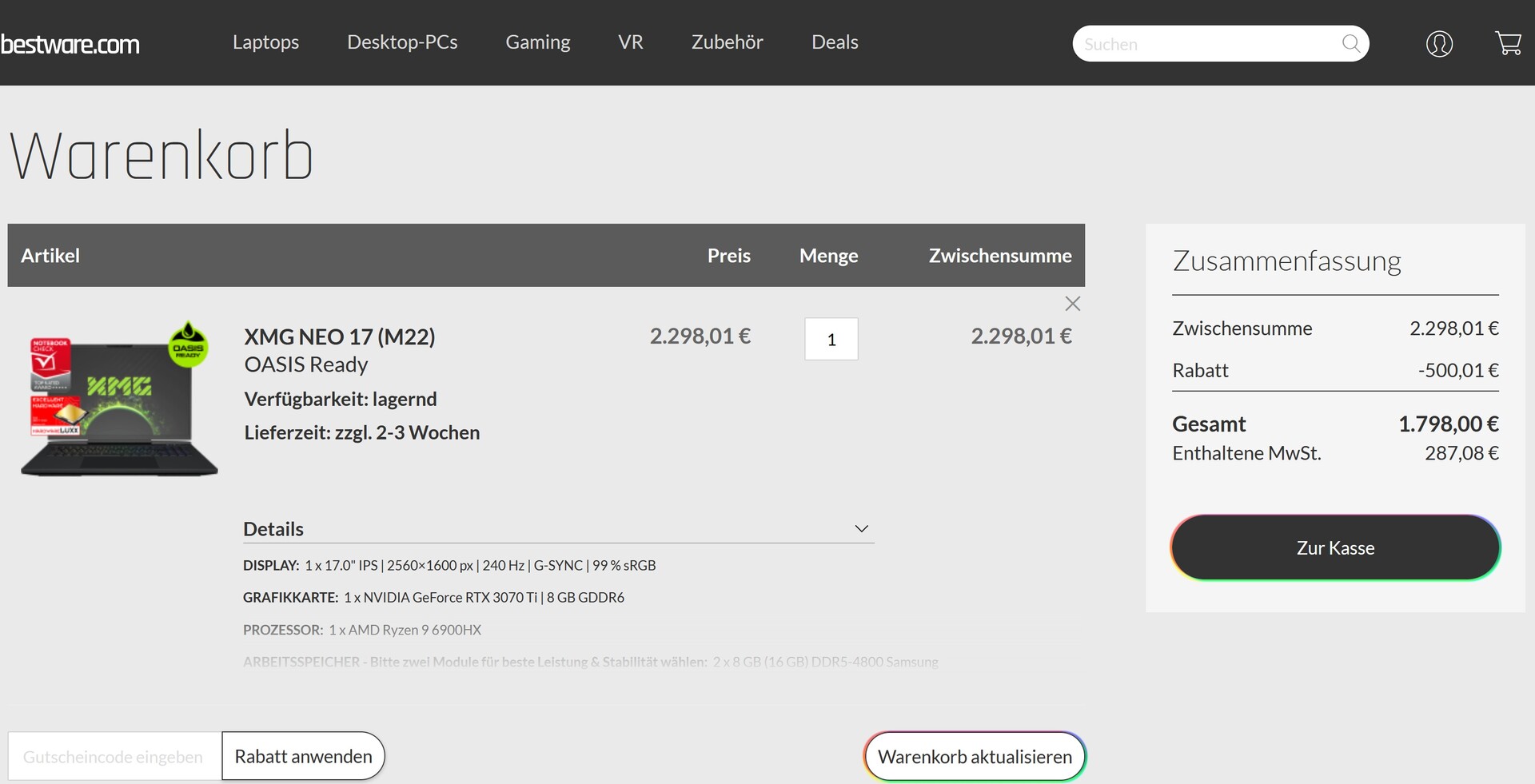 Im Bestware Shop ist derzeit der Schenker XMG Neo 17 Gaming-Laptop mit 500 Euro Rabatt erhältlich. Für einen Preis von 1.798 Euro erhält man neben einer Nvidia GeForce RTX 3070 Ti ein 17 Zoll großes 16:10-IPS-Display mit QHD+ Auflösung und schnellen 240 Hz, einen AMD Ryzen 9 6900HX sowie eine mechanische RGB-Tastatur mit Cherry-MX-Switches.