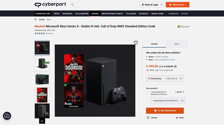 Die Xbox Series X kann derzeit im Bundle mit Call of Duty: Modern Warfare III und Diablo IV bei Cyberport für nur 499 Euro bestellt werden. Der Versand kostet zusätzlich 6,99 Euro, allerdings lassen sich bei Anmeldung zum Newsletter 5 Euro sparen. Alternativ wird ein Paket mit Xbox Series X, CoD: Modern Warfare III und Forza Horizon 5 ebenfalls für 499 Euro angeboten.