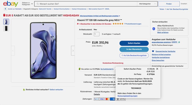 Das Xiaomi 11T kann aktuell im offiziellen ebay-Shop von Asgoodasnew für nur 279,86 Euro bestellt werden, solange der Gutscheincode "TECHNIK23" angegeben wird. Der Versand nach Deutschland ist kostenlos, Österreicher müssen 5,90 Euro für die Lieferung bezahlen. Laut Preisvergleich ist das Modell mit 8 GB RAM und 128 GB Flash-Speicher derzeit ansonsten nicht unter 319 Euro zu finden, der Listenpreis liegt bei 549 Euro.