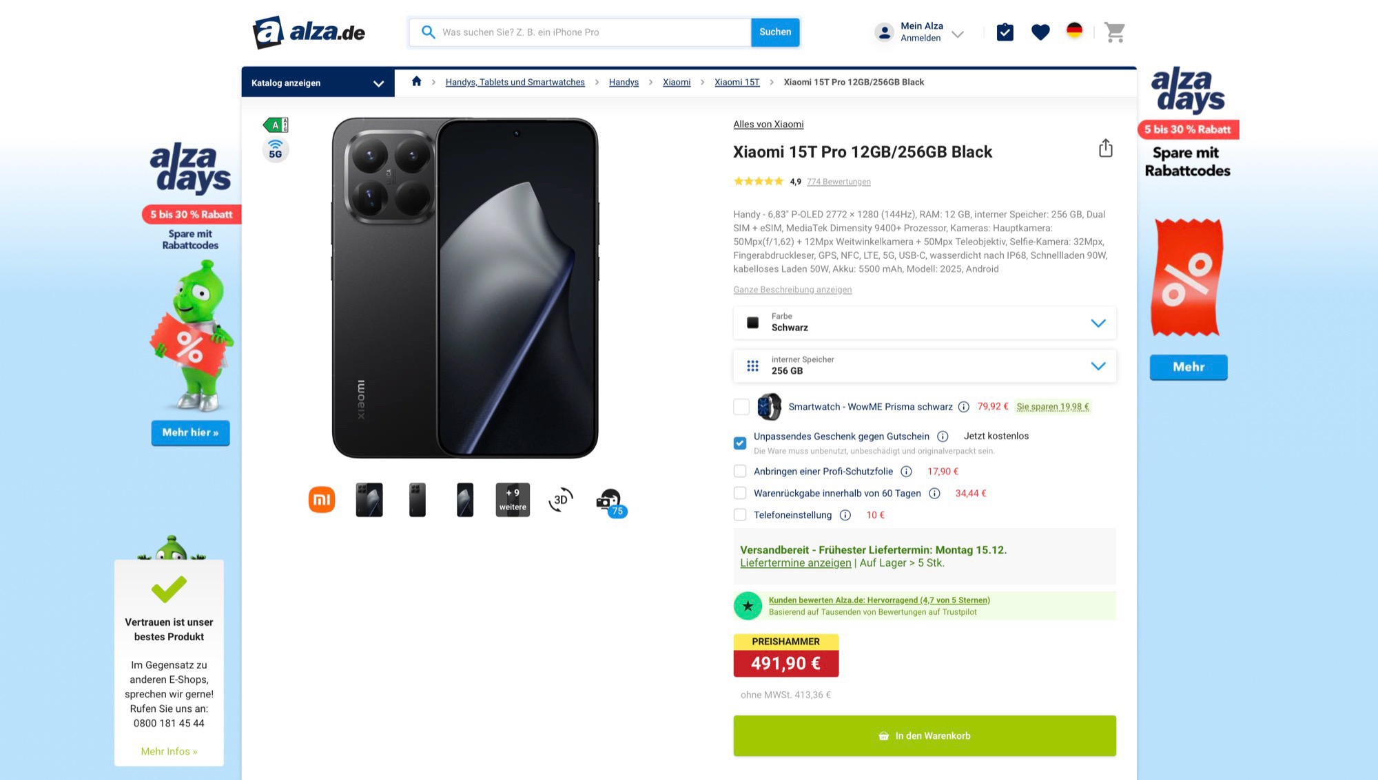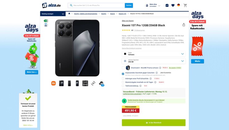 Das Xiaomi 15T Pro mit 12 GB Arbeitsspeicher und 256 GB Flash-Speicher in der Farbe Schwarz wird aktuell bei Alza für nur 491 Euro zuzüglich 4,99 Euro Versand angeboten. Laut Preisvergleich ist dies das erste Mal, dass das Smartphone für unter 500 Euro angeboten wird. Aktuell kostet das Xiaomi 15T Pro ansonsten mindestens 566 Euro, das Gerät ist Ende September für eine unverbindliche Preisempfehlung von 799 Euro auf den Markt gekommen.