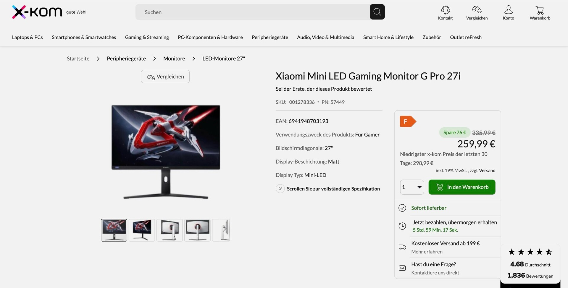 Der Xiaomi G Pro 27i Gaming-Monitor kam im August 2024 für 342 Euro auf den Markt, und konnte schon damals ein interessantes Preis-Leistungs-Verhältnis bieten. Derzeit wird der Bildschirm bei X-Kom für nur 259 Euro angeboten, laut Preisvergleich der Allzeit-Bestpreis für den Monitor, der aktuell ansonsten nicht unter 283 Euro zu finden ist.