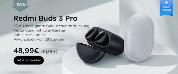 Xiaomi verkauft seine TWS-Earphones Redmi Buds 3 Pro zur Zeit statt für 69,99 Euro für nur 59,99 Euro. Noch günstiger sind die kabelosen ANC-Ohrhörer bei Goboo zu finden. Die Redmi Buds 3 Pro zum Sparpreis in Gletscher Grau kosten dort sogar nur 48,99 Euro. Das ist nochmals 11 Euro billiger als beim Hersteller und ihr spart bei diesem Top-Angebot aus Spanien satte 21 Euro auf den Listenpreis von Xiaomi.