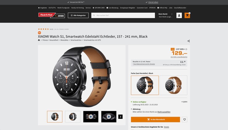 Die Xiaomi Watch S1 kann aktuell bei Saturn und bei MediaMarkt für nur 129 Euro bestellt werden. Das entspricht einem Rabatt von 100 Euro im Vergleich zur unverbindlichen Preisempfehlung, im Preisvergleich ist die Uhr ansonsten nicht unter 148 Euro zu finden.