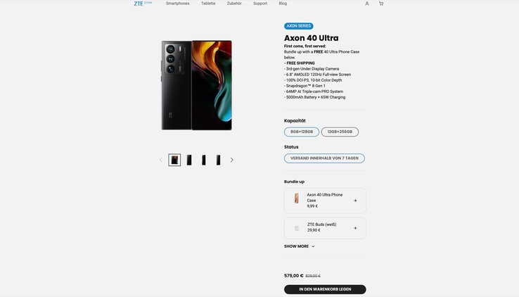 Das ZTE Axon 40 Ultra kann aktuell direkt im Onlineshop des Herstellers für 579 Euro statt 829 Euro bestellt werden. Dabei handelt es sich um die Variante mit 8 GB Arbeitsspeicher und 128 GB Flash-Speicher, die im Preisvergleich nicht unter 762 Euro zu finden ist. Die Version mit 12 GB RAM und 256 GB Speicher wird derzeit für 699 Euro angeboten.