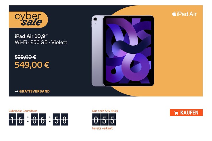 Das Apple iPad Air der fünften Generation, das im Jahr 2022 auf den Markt gekommen ist, kann derzeit im Rahmen des Cyberport Cybersale für nur 549 Euro bestellt werden, und zwar in einer Variante mit violetter Aluminium-Rückseite und 256 GB Speicher. Dieses Angebot gilt nur bis zum Freitag, dem 26. August, um 09:00 Uhr, maximal aber, bis 600 Einheiten verkauft wurden.