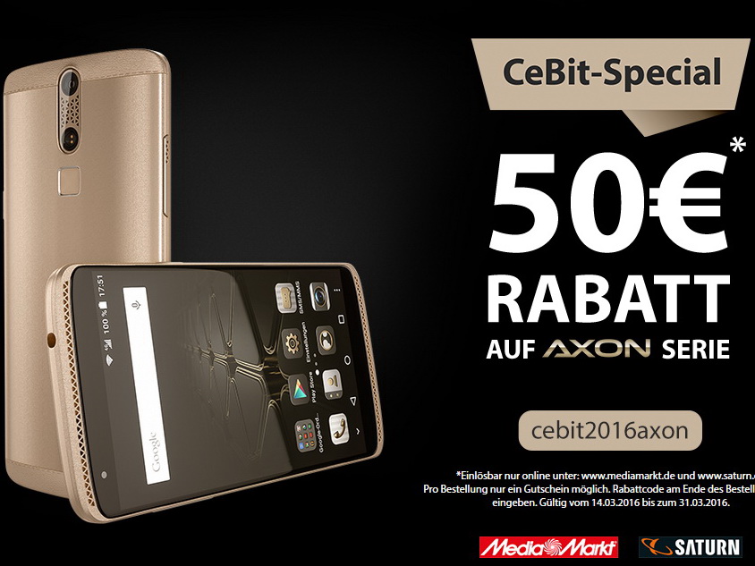 ZTE lockt mit einem ganz besonderen Angebot: Bis zum 31. März 2016 gewährt der chinesische Telekommunikationsausrüster beim Kauf eines Smartphones der ZTE Axon-Serie einen Rabatt in Höhe von 50 Euro. Für den Deal muss der Kunde lediglich den Aktionscode der Microseite www.zte-axonmini.de am Ende des virtuellen Einkaufs eingeben. Einlösbar ist Code nur bei Onlinebestellungen über die ZTE-Kooperationspartner Mediamarkt.de oder Saturn.de. Pro Bestellung wird nur jeweils ein Gutschein akzeptiert.