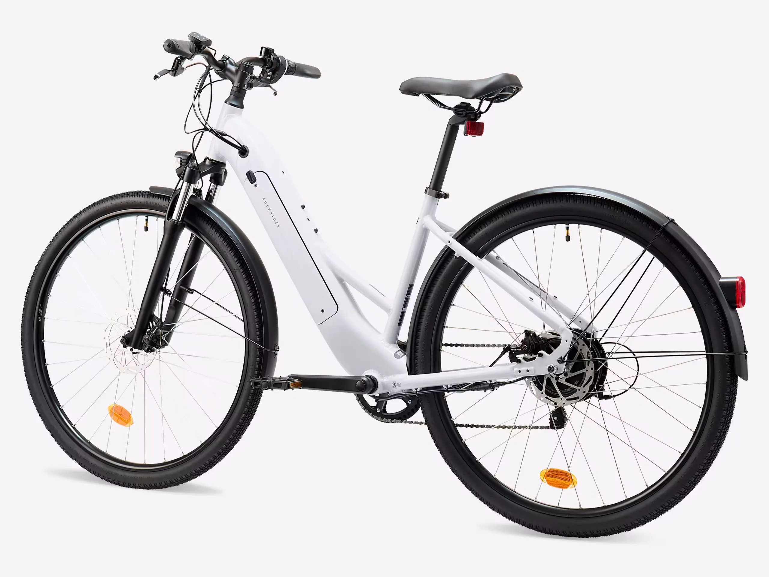 Decathlon bietet das E-ACTV 100 mit einer unvollständigen Ausstattung an. So fehlen ein Gepäckträger und auch ein Fahrradständer, wobei sich diese aber leicht nachrüsten lassen. Im Auslieferungszustand schon vorhanden sind Schutzbleche und eine Beleuchtung, damit lässt sich bei Nässe oder etwa in der Dunkelheit einigermaßen geschützt und insbesondere legal und sicher fahren. Beworben wird die Verwendung von Rockrider-Trekkingreifen - diese sind 47 Millimeter dick und sollen durch einen doppelten Polyamid-Schutz vor Perforationen gut geschützt sein. Gebremst wird vorne und hinten mit mechanischen und nicht mit hydraulischen Scheibenbremsen mit jeweils 160 Millimeter großen Bremsscheiben.