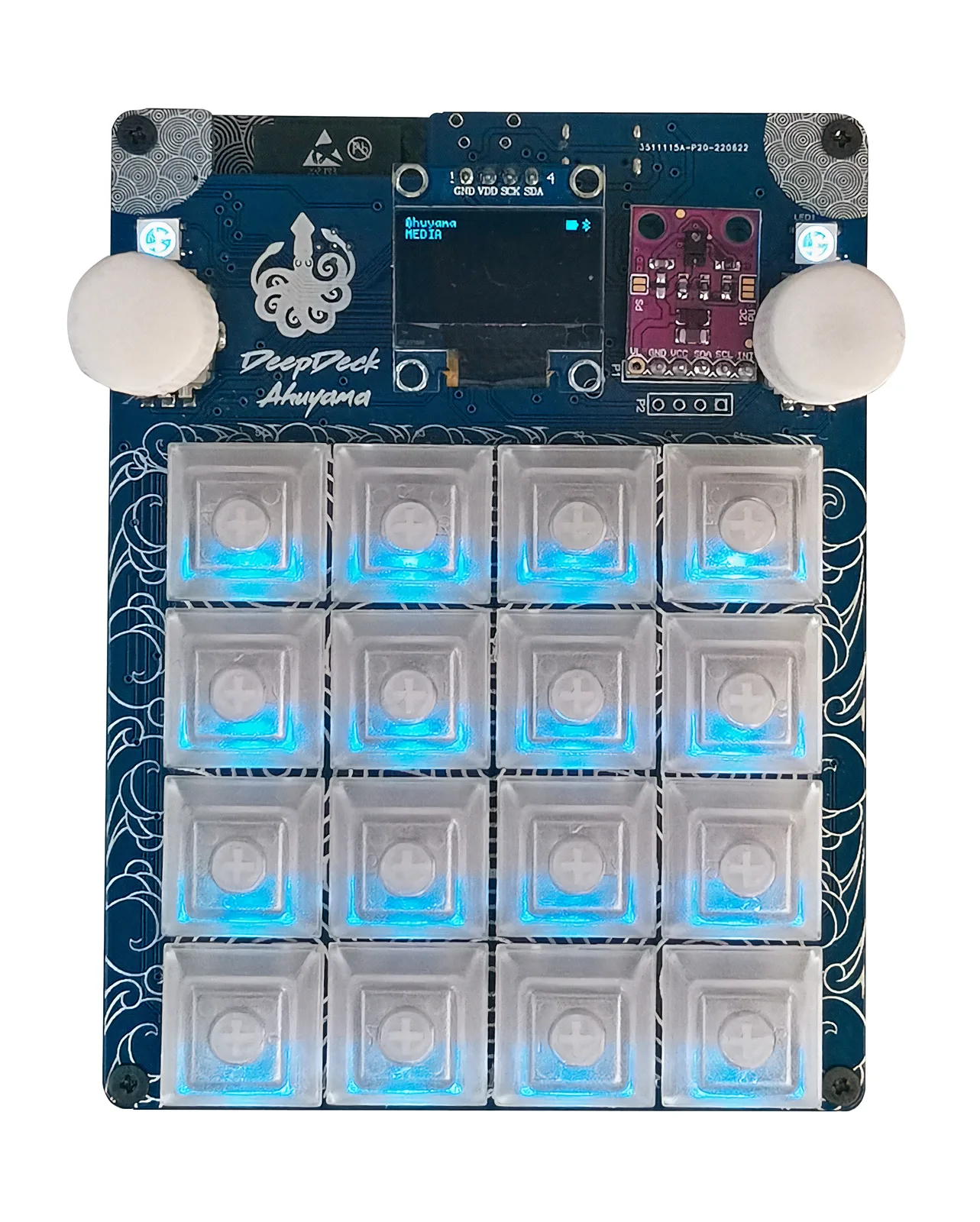 Zwischen den beiden Drehreglern ist ein OLED-Bildschirm mit einer Auflösung von 64 x 128 Pixeln zu finden, welches zur Anzeige verschiedener Parameter oder auch zur Navigation durch Menüstrukturen genutzt werden kann. Tatsächlich soll sich das DeepDeck extrem vielfältig einsetzen lassen - was durch den durch das ESP32-Modul abgedeckten WiFi- und Bluetooth-Support unterstützt wird.