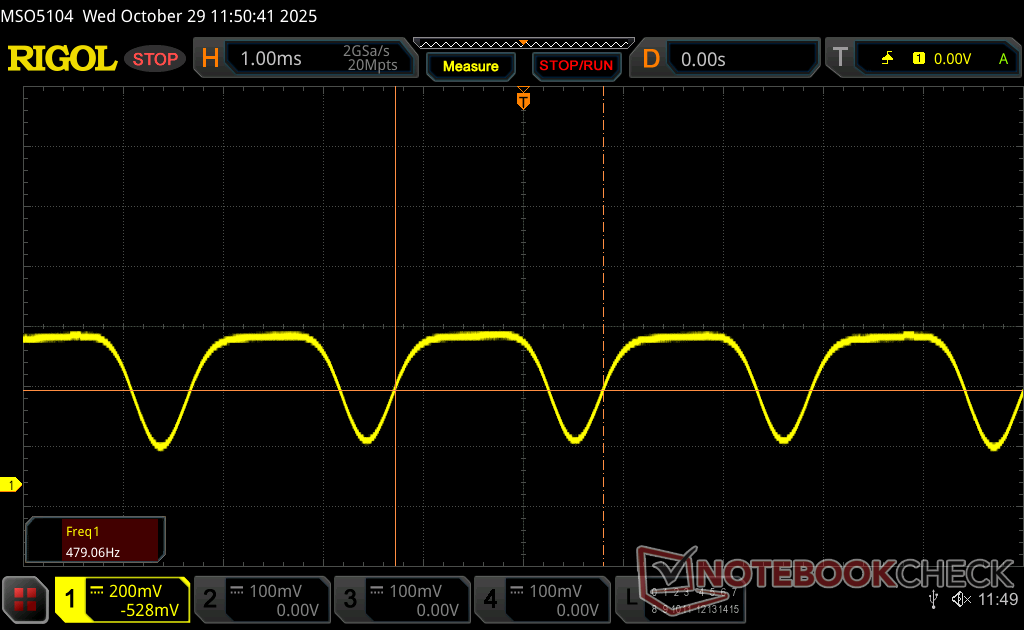 Das Display flackert mit 490.8 Hz (im schlimmsten Fall, eventuell durch Pulsweitenmodulation PWM) bei einer eingestellten Helligkeit von 100 % und darunter. Darüber sollte es zu keinem Flackern kommen. Die Frequenz von 490.8 Hz ist relativ hoch und sollte daher auch bei den meisten Personen zu keinen Problemen führen. Empfindliche User sollen laut Berichten aber sogar noch bei 500 Hz und darüber ein Flackern wahrnehmen. Im Vergleich: 53 % aller getesteten Geräte nutzten kein PWM um die Helligkeit zu reduzieren. Wenn PWM eingesetzt wurde, dann bei einer Frequenz von durchschnittlich 8152 (Minimum 5, Maximum 343500) Hz. | |||