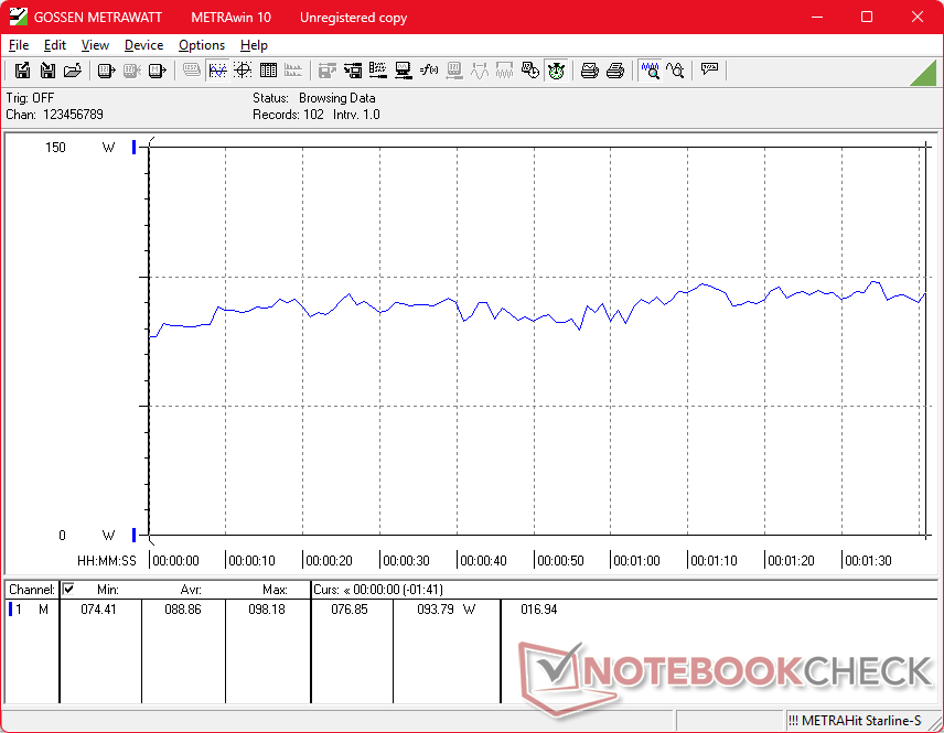 Im Leerlauf auf dem Desktop können bis zu 6 W im Energiesparmodus mit aktiver iGPU oder bis zu 33 W im Performance-Modus mit aktiver dGPU und einem OLED-Bildschirm, der hauptsächlich weiße Farben anzeigt (z. B. beim Browsen), verbraucht werden. Der Verbrauch bei anspruchsvolleren Lasten ist ansonsten ähnlich wie beim Vorjahresmodell, wenn nicht sogar etwas geringer, um die Leistung pro Watt zu verbessern, zumal das Dell 16 Premium mit dem gleichen 130-W-USB-C-Netzteil (~12,8 x 5,5 x 2,3 cm) wie zuvor ausgeliefert wird.
