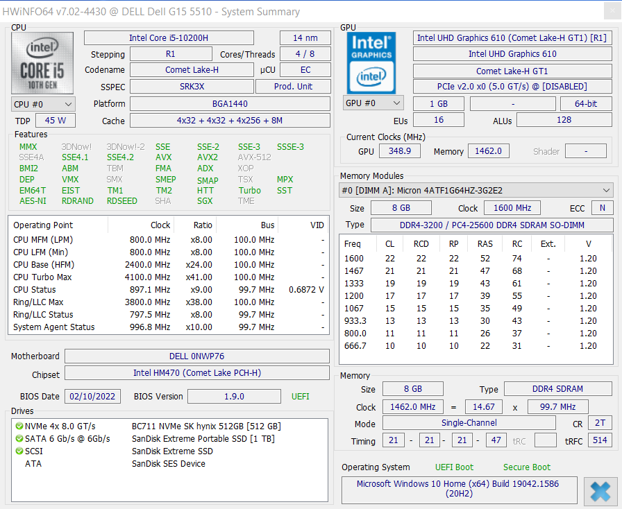 Der verbaute Core i5-10200H stammt aus Intels 10. Prozessorgeneration und basiert auf der Comet-Lake-Architektur (4. Generation der Skylake Architektur), ist somit nicht mehr taufrisch. Er setzt sich aus vier Kernen (Quad-Core-CPU) zusammen, die mit 2,4 GHz Basistakt und maximal 4,1 GHz arbeiten. Dazu kombiniert Dell einen RAM-Riegel mit 8 GB vom Typ DDR4-3200.