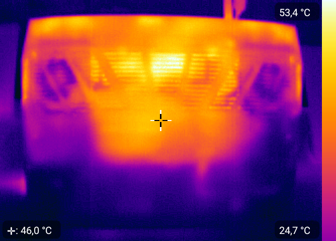 (-) Auf der Unterseite messen wir eine maximalen Wert von 51.9 °C (im Vergleich zum Durchschnitt von 43.3 °C).