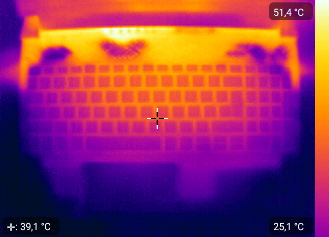 Der Bereich des Touchpads und der Tastatur bleibt aber in jeder Lebenslage so kühl, dass eine Bedienung problemlos möglich ist. Im Idle-Betrieb sind die meisten Teile des Gaming-Notebooks kaum wärmer als Raumtemperatur, aber immer über den Werten der AMD Version.