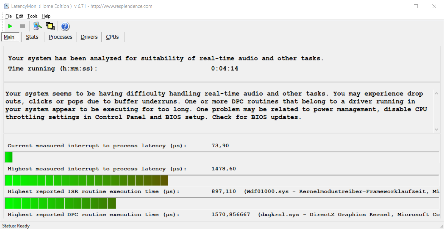 Im Stresstest (Prime95 und Furmark laufen für mindestens eine Stunde) pendelt sich die CPU nach kurzem Anfangshoch am Limit bei rund 3,3 GHz und einer Temperatur von rund 93 °C ein. Die Grafikkarte arbeitet im Schnitt mit 1.550 MHz relativ knapp unter dem Maximum auf konstantem Niveau bei einer Temperatur von etwas unter 85 °C. Das System läuft auch bei voller Auslastung stabil.