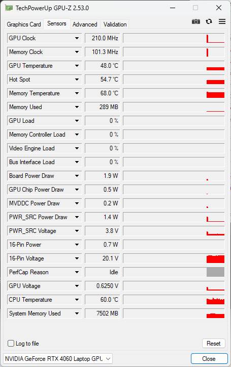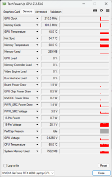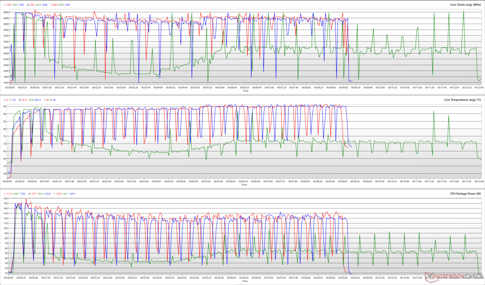 Die GPU erreicht einen maximalen Verbrauch von 152,2 W mit einer Geschwindigkeit von 2.535 MHz. Schlussendlich pendelt sich der Prozessor bei 2,5 GHz (bei 71 W) ein, die Grafikkarten bei 2.399 MHz (bei 81 W).
