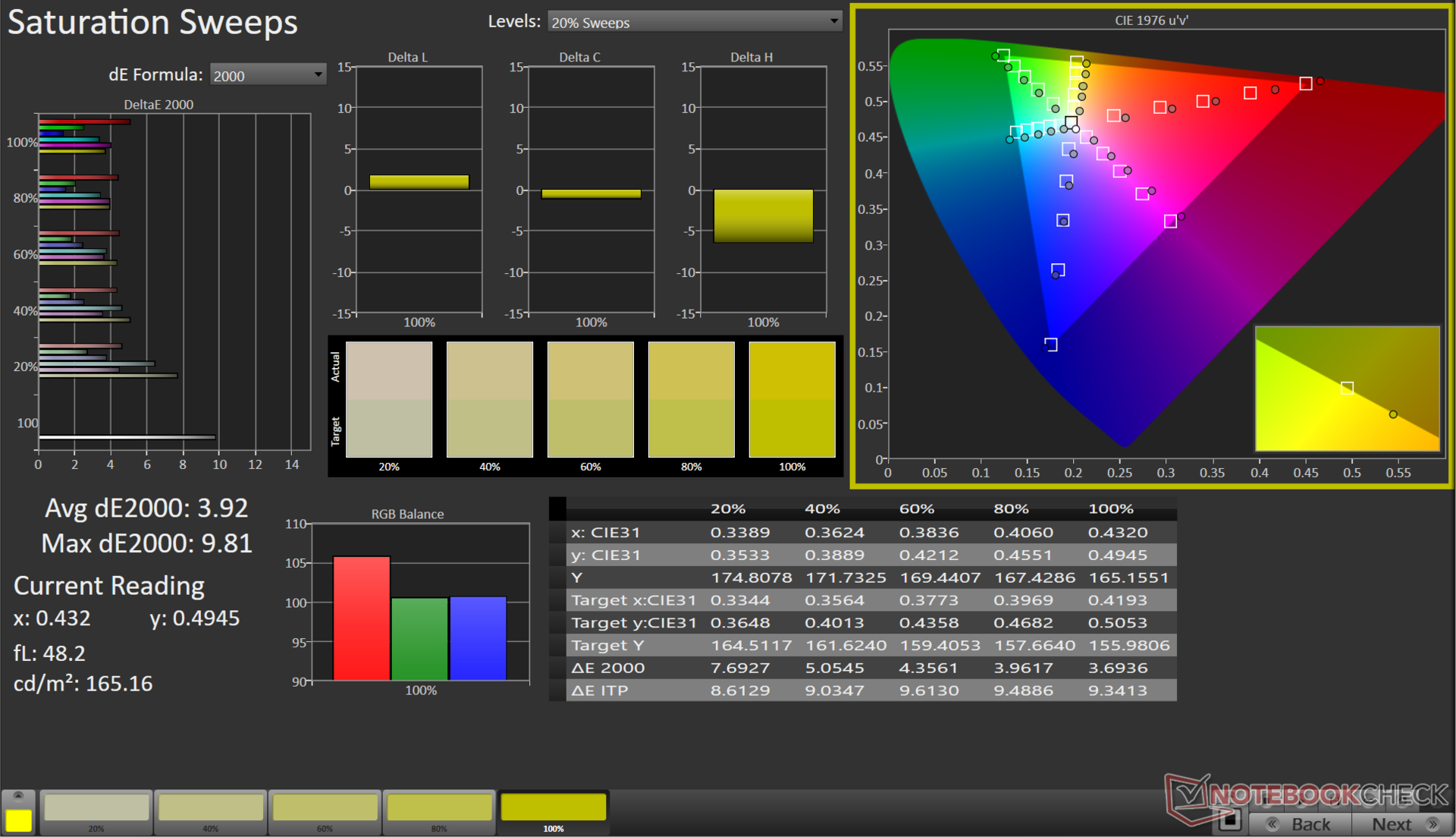| sRGB Coverage (%) | 98.4 | 99.9 2% | 98.8 0% | 99.92 2% | 61 -38% | 97.3 -1% | 100 2% | 98 0% |