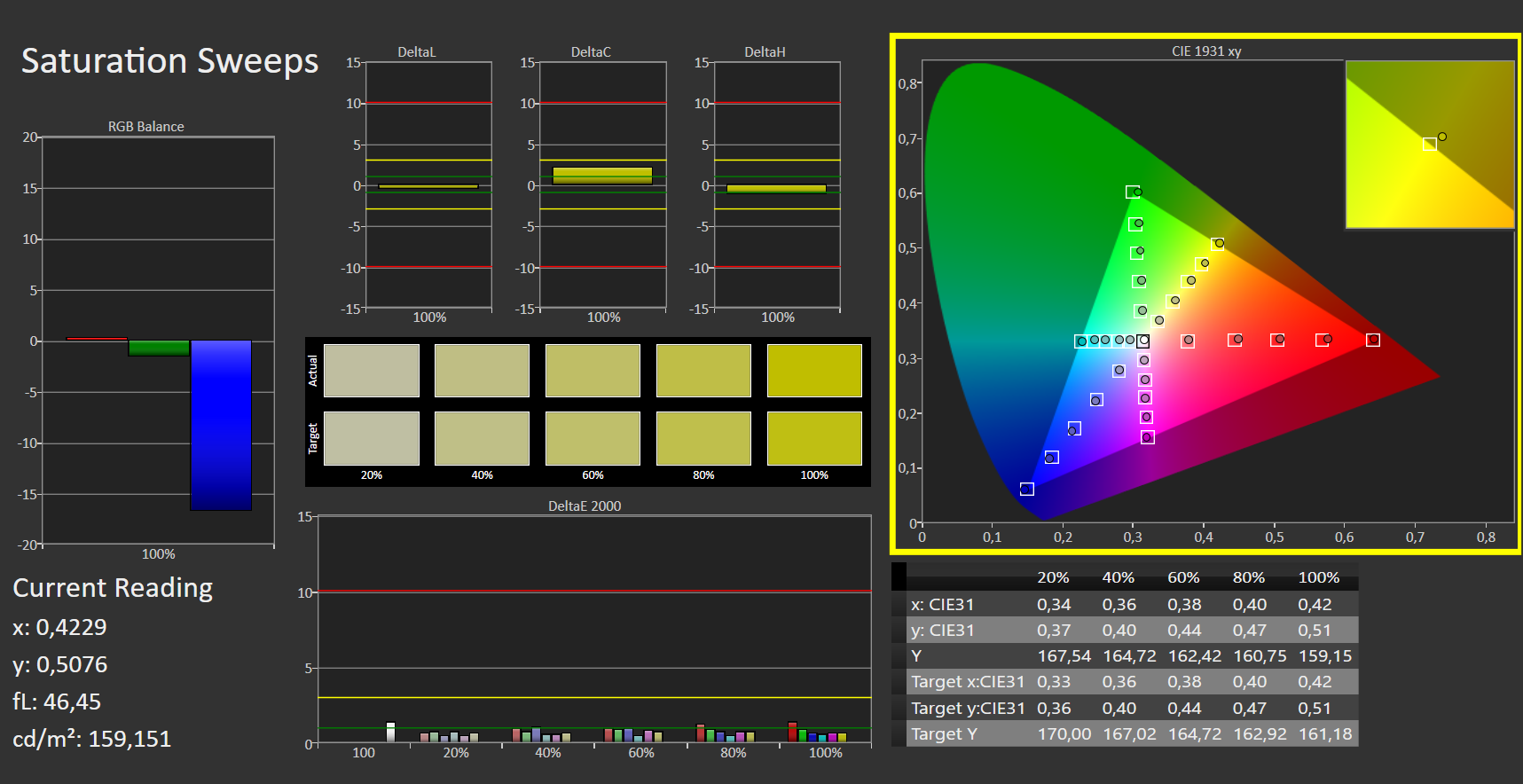 Die CalMAN-Analyse zeigt außerdem, dass das Panel bereits ab Werk nur eine geringe Abweichung bei der Darstellung von Farben aufweist. Dieser bereits gute Wert lässt sich aber durch eine Kalibration dennoch etwas verbessern. Die entsprechende ICC-Datei kann im Fenster oben rechts neben der Grafik zur Ausleuchtung des Bildschirms heruntergeladen werden.
