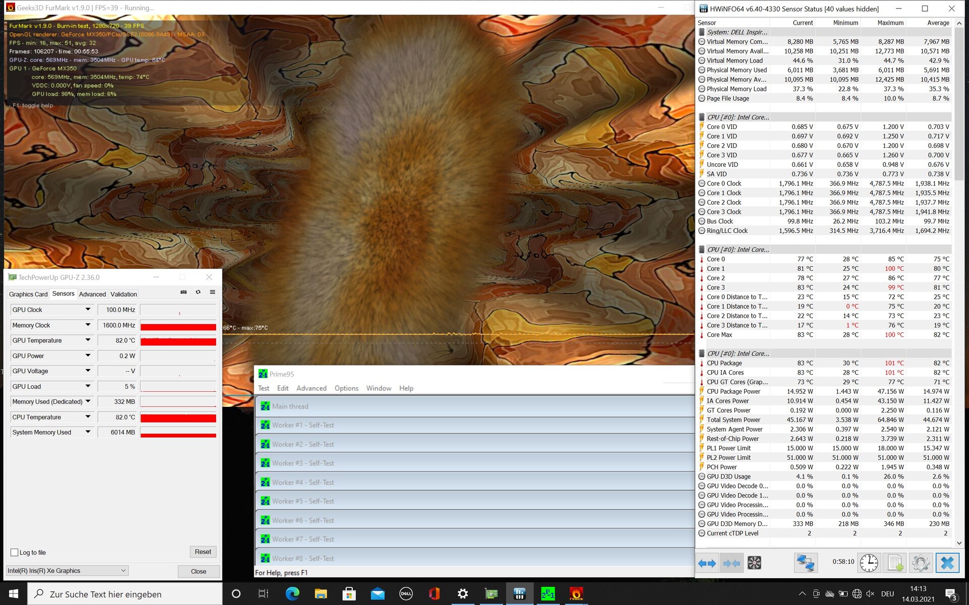 Während unseres circa einstündigen Dauerstresstests stiegen die Temperaturen im Inneren des Inspiron 14 7400 auf bis zu 100 °C. Die Taktraten sanken dabei kurzzeitig auf 367 MHz, womit der Basistakt deutlich unterschritten wurde. Bis zum Ende des Test konnte das Kühlsystem die Frequenz auf einen Durchschnittswert von 1,9 GHz anheben, womit sich das System noch flüssig bedienen lies. Bei leistungsintensiven Anwendungen, müssen Nutzer daher vor allem zu Beginn mit einem Einbruch der Leistung rechnen.
