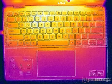 Die Oberflächentemperaturen sind kühler als beim Inspiron 14 7620 2-in-1 aus dem letzten Jahr. Unter Last beispielsweise erreichen die Hotspots auf der Ober- und Unterseite nur 36 bzw. 39 °C, verglichen mit 46 °C beim Vorjahresmodell. Der hohe Temperaturbereich von 30 °C ist vergleichbar mit Modellen wie dem IdeaPad Flex 7i 14.