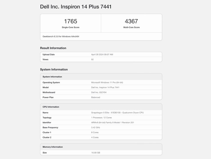 Das Geekbench-Resultat von 1.765 Punkten (Single-Thread) respektive 4.367 Punkten (Multi-Thread) fällt weit hinter den von Qualcomm beworbenen Werten von 2.900 Punkten mit einem Kern bzw. 15.400 Punkten mit allen Kernen zurück. Das Dell Inspiron 14 Plus dürfte daher entweder mit einer enorm geringen TDP getestet worden sein, oder es handelt sich um ein Vorserien-Modell, das noch nicht annähernd fertiggestellt wurde. Nach Betrugsvorwürfen rund um die beworbenen Benchmark-Ergebnisse des Snapdragon X Elite bleibt abzuwarten, wie schnell der Chip letztendlich wirklich ist. Die ersten Laptops mit dem bisher schnellsten ARM-Chip von Qualcomm sollen schon in den nächsten Wochen auf den Markt kommen.