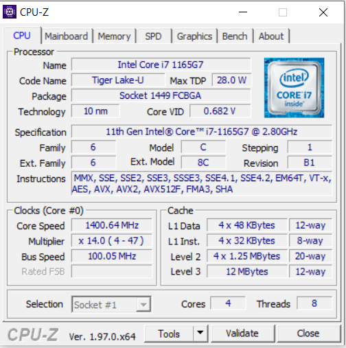 Der Core-i7-1165G7-Vierkernprozessor (Tiger Lake) arbeitet mit einem Basistakt von 2,8 GHz. Mittels Turbo ist eine Steigerung auf 4,1 GHz (vier Kerne) bis 4,7 GHz (ein Kern) möglich. Hyperthreading (zwei Threads pro Kern) wird unterstützt. Die CPU stellt genug Rechenleistung für den Office- und Internetbetrieb bereit, bleibt aufgrund einer geringen TDP von 13 Watt aber unterhalb des 1165G7-Durchschnitts.