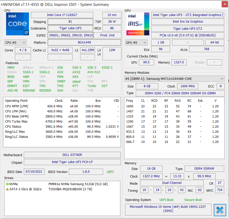 | 80.5 % v7 (old) | 10 / 2021 | Dell Inspiron 15 3501 i7-1165G7, Iris Xe G7 96EUs | 2 kg | 19.9 mm | 15.60" | 1920x1080 | |