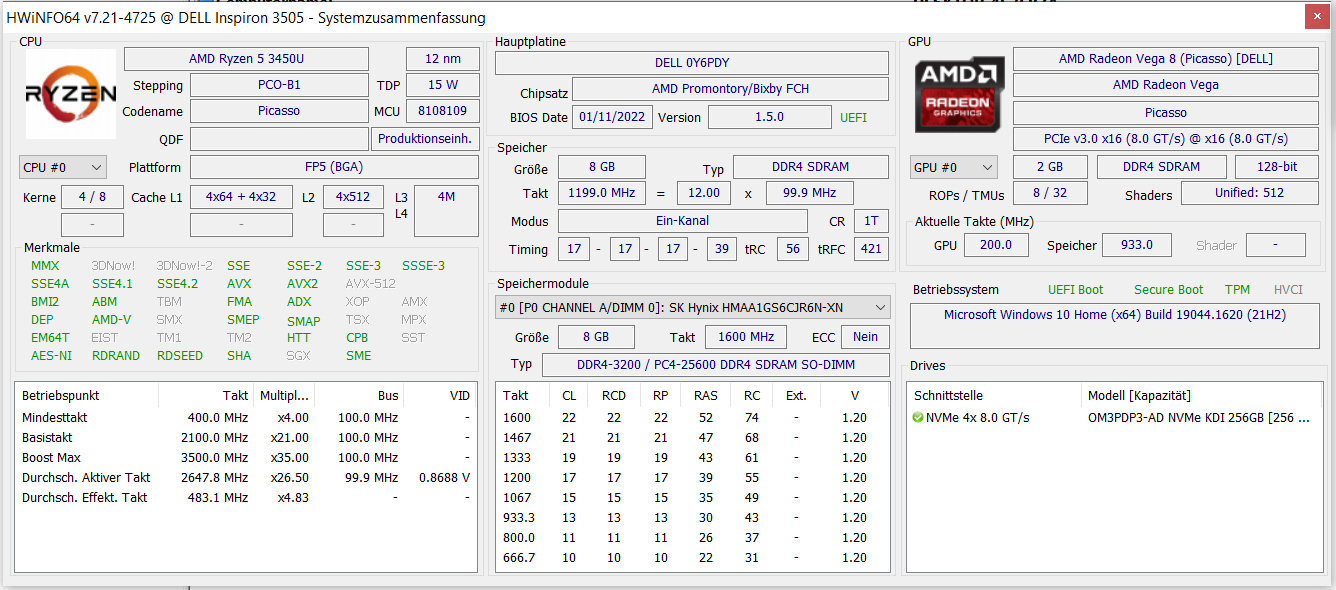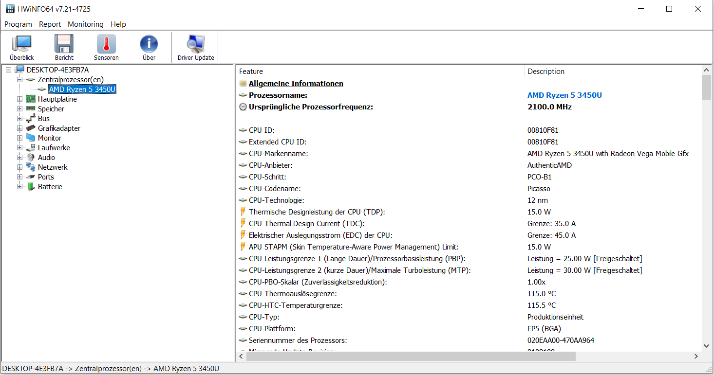 Höchstleistungen dürfen nicht erwartet werden: Die nicht mehr taufrische APU (Anfang 2020) kann nur für einen kurzen Zeitraum eine höhere Leistung liefern. Bei länger anhaltender Last sinken die Taktraten von CPU und GPU deutlich.