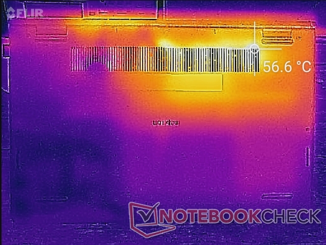 Die Hot Spots befinden sich auf der Rückseite des Gerätes, wo sich der Prozessor und das Kühlsystem befinden. Die Temperaturen erreichen oben bis zu 38 °C und unten bis zu 57 °C. Beim Lenovo IdeaPad 3 15 sind es nur 31 und 43 °C. Die Handballenauflagen sowie der Großteil der Tastatur bleiben unabhängig von der Last deutlich kühler, was den Arbeitsalltag angenehm gestaltet.
