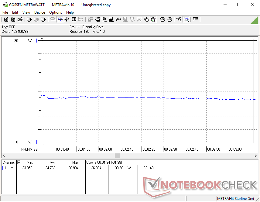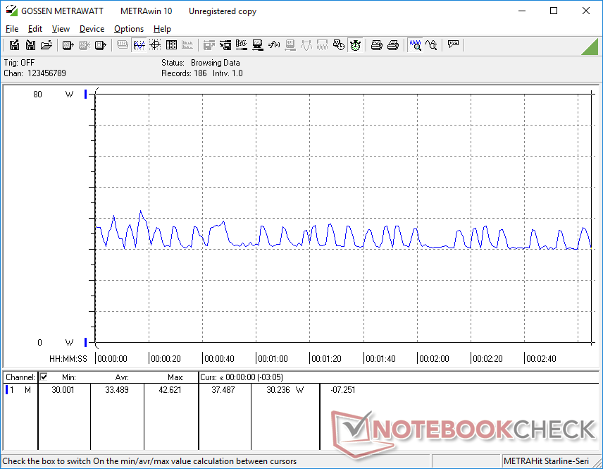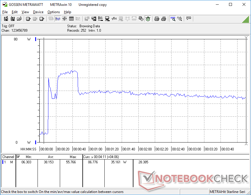 Im Leerlauf verbraucht das System zwischen 3 W und 7 W, was effizienter ist als die meisten anderen 15,6 Zoll großen Serie-U-Laptops. Interessanterweise ist der Verbrauch während Witcher 3 nicht konstant, das System schwankt zwischen 30 W und 42 W, auch wenn die Frameraten stabil zu sein scheinen.