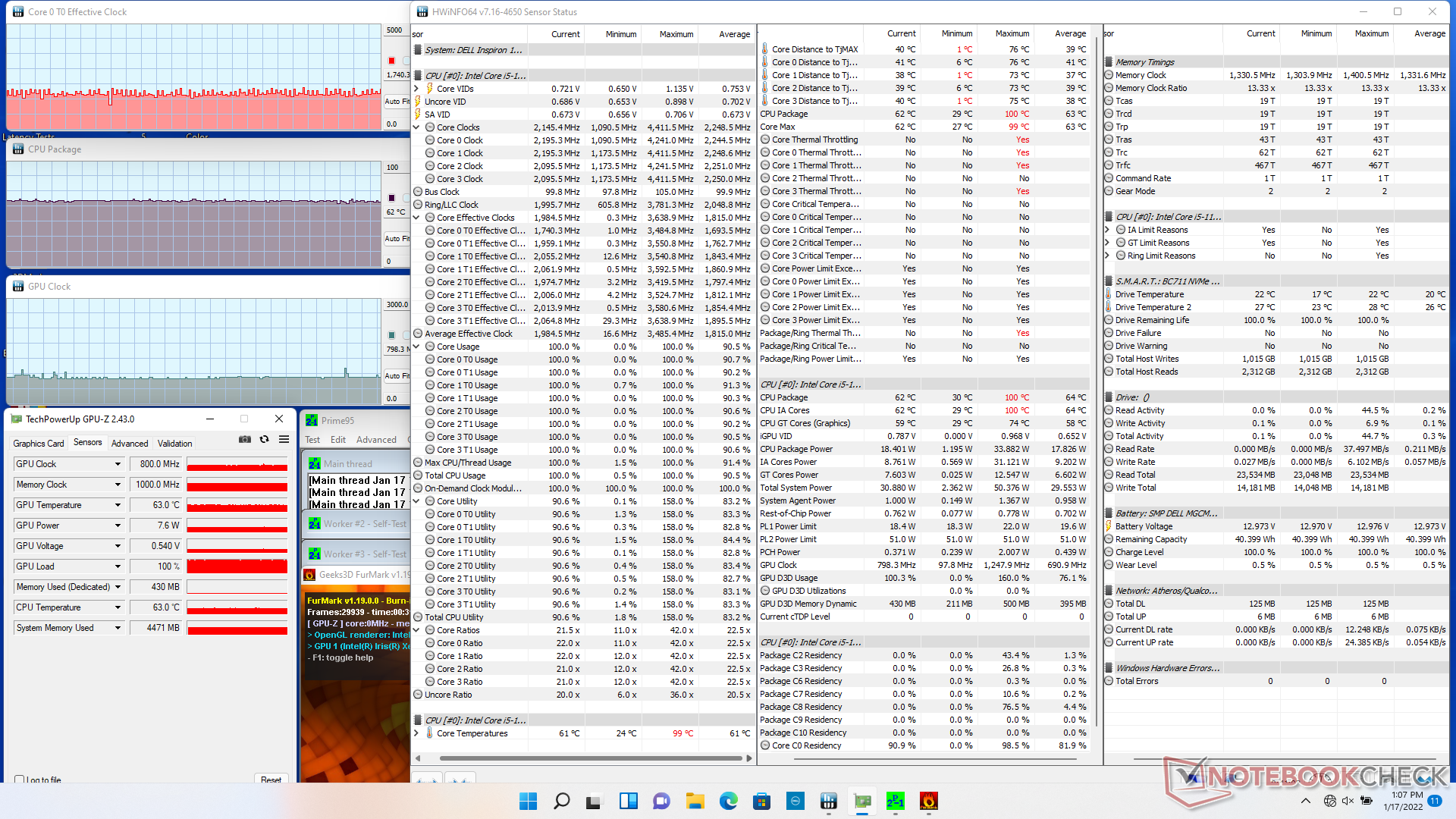| Prime95 + FurMark Stress | 1.4 - 1.7 | 800 | 62 |