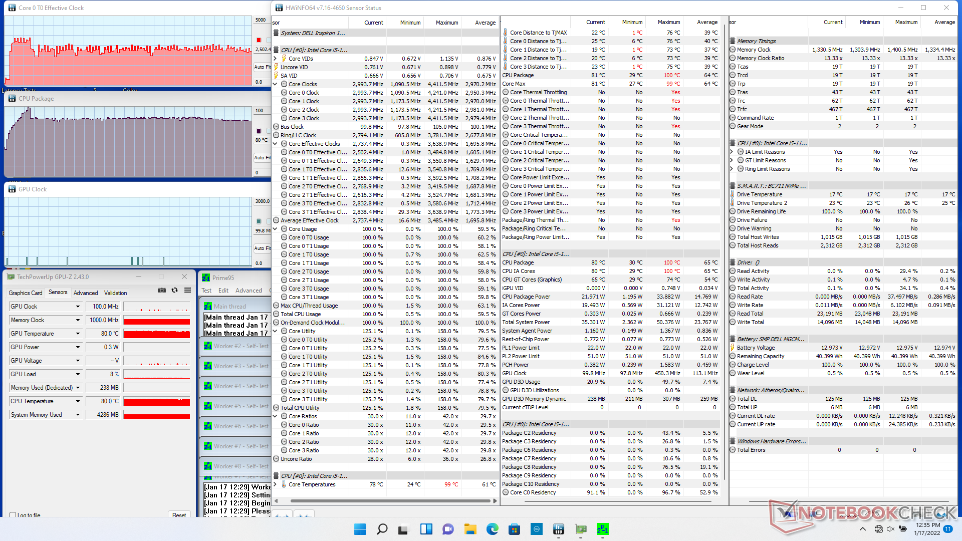 Unter Prime95 taktet die CPU für die ersten Sekunden auf 3,5 GHz hoch. Wenn 100 °C erreicht werden fallen die Taktraten auf 2,5 bis 2,8 GHz, um stabile Temperaturen von um die 80 °C nicht zu überschreiten. Die CPU Package Power erreicht beim Start 34 W und stabilisiert sich bei 22 W. Der gleiche Test erbringt auf einem Asus Vivobook 15 K513EQ mit Core i7