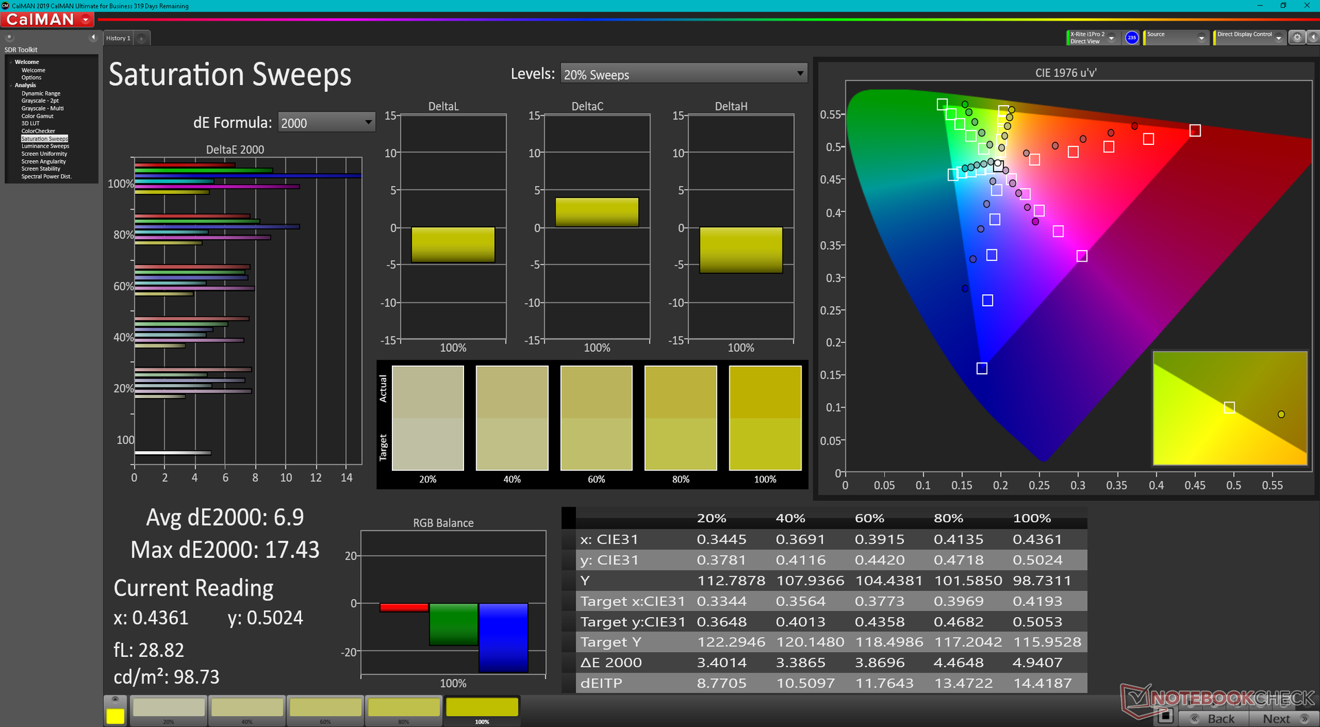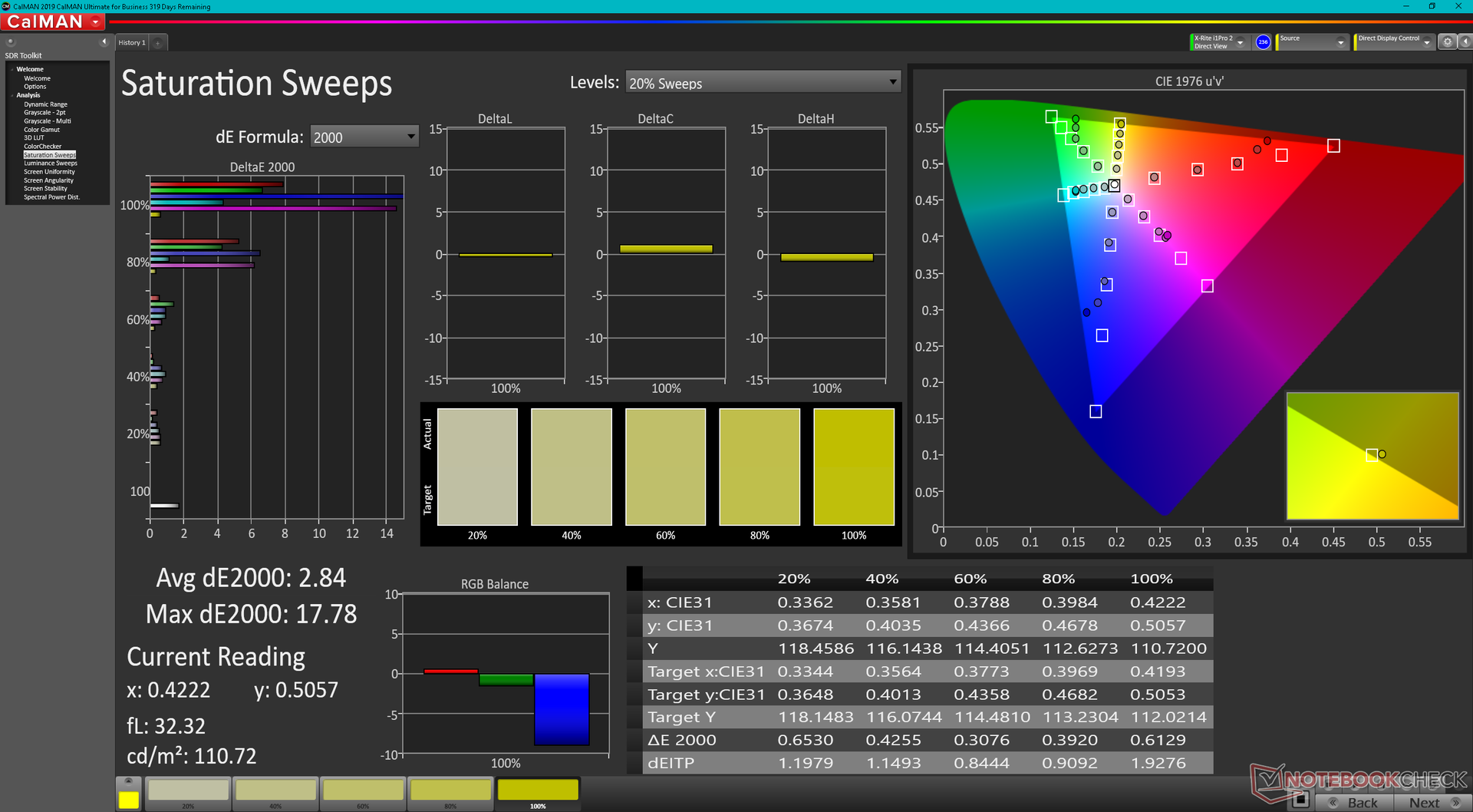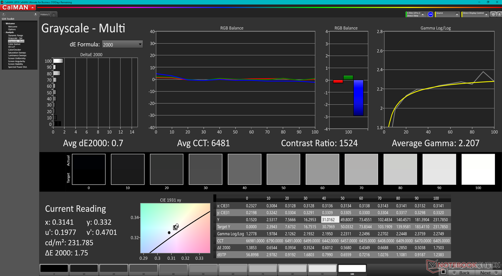 Die Farbtemperatur fällt ab Werk etwas zu warm aus. Nach einer manuellen Kalibrierung fallen die durchschnittlichen Graustufen- und DeltaE-Werte von 5,1 und 6,34 auf nur noch 0,7 und 2,08. Dennoch sorgt der schwache Farbraum dafür, dass die Farbabweichungen mit steigender Sättigung wieder signifikant zunehmen.