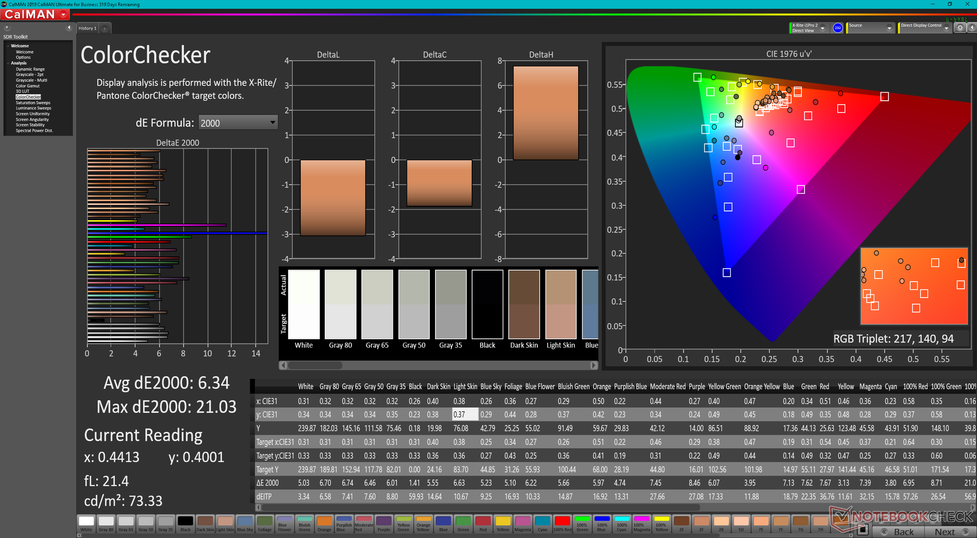 | Colorchecker dE 2000 max. * | 21.03 | 6.4 70% | 6.76 68% | 7 67% | 19.75 6% | 19.49 7% |