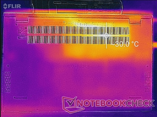 Die Oberflächentemperaturen sind in der Mitte der Tastatur am wärmsten. Nichtsdestotrotz wird diese heiße Stelle bei anspruchsvoller Last nur etwa 35 °C betragen und sich daher nie unangenehm anfühlen. Achten Sie darauf, die Lüftungsgitter auf der Unterseite nicht zu blockieren, die mit über 44 °C deutlich wärmer werden können.