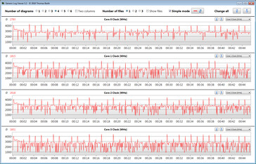 Der Multi-Thread-Test des Cinebench-R15-Benchmarks wird kurzzeitig mit 3,3 bis 4 GHz bearbeitet, dann schwankt der Takt zwischen 600 MHz und 3 GHz. Der Single-Thread-Test wird mit 1,6 bis 4,4 GHz durchlaufen. Im Akkubetrieb liegen die Taktraten niedriger.