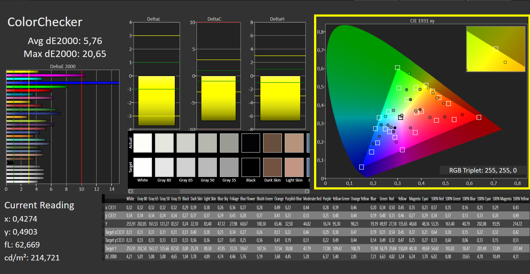 | Delta E Colorchecker * | 5.76 | 3.2 44% | 0.8 86% | 2.95 49% | 2.73 53% |