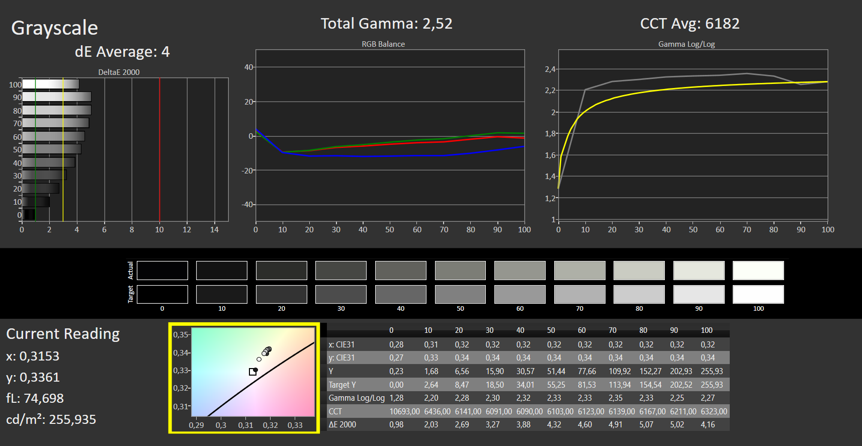ΔE Greyscale Calman: 4 | ∀{0.09-98 Ø5}