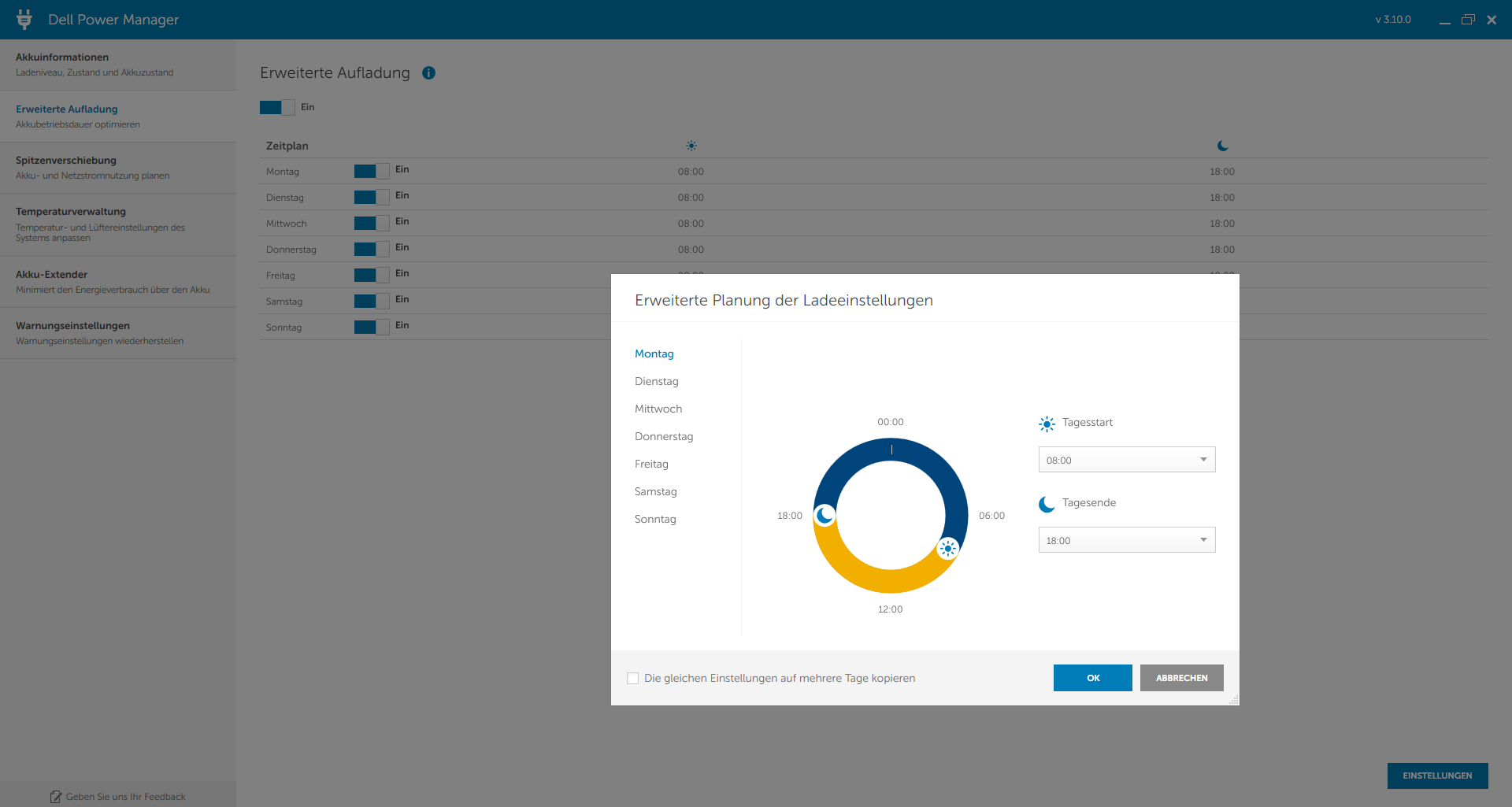 Im Dell Power Manager gibt es einige interessante Möglichkeiten für das Lade- und Energie-Management. So können Betreiber einer Solar-Insel den Laptop nur tagsüber laden lassen, während nachts zwingend Akku-Energie genutzt wird - selbst bei angeschlossenem Netzteil!