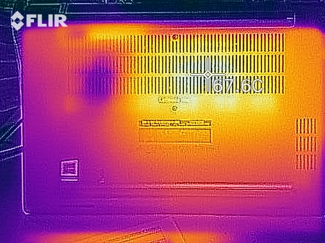 Das Dell Latitude 7300 erreicht durchaus hohe Außentemperaturen am Gehäuse. Maximal messen wir unter Last 54 °C an der Unterseite, womit die wichtige 50-°C-Marke eindeutig gerissen wird. Auf dem Schoss sollte man das Dell-Laptop also unter Last eher nicht nutzen. Zudem bleibt leider auch die Handballenauflage nicht komplett kühl, auf der linken Seite erwärmt sie sich auf maximal 33 °C in der Mitte. Das ist noch nicht bedenklich, aber schon fühlbar warm.