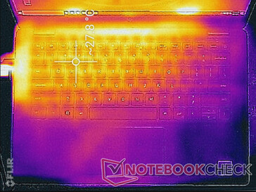 Die Oberflächentemperatur ist auf der linken Seite des Laptops wärmer als auf der rechten. Das zeigt auch unsere Heatmap unten. Unter kombinierter Last von Prime95 und FurMark erreichen die Hotspots bis zu 45 bzw. 53 °C (oben bzw. unten). In diesen Fällen kann das Tippen auf der linken Seite der Tastatur etwas unangenehm sein.