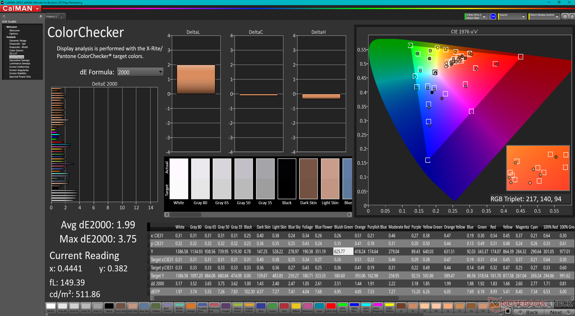 Das Panel ist bereits gut kalibriert ab Werk, und daher ist eine Kalibrierung durch den Endbenutzer nicht so notwendig. Eine Kalibrierung des Bildschirms würde die durchschnittlichen Graustufen- und Farb-DeltaE-Werte sogar noch weiter von 2,8 und 1,99 auf nur 1,0 bzw. 0,72 senken.