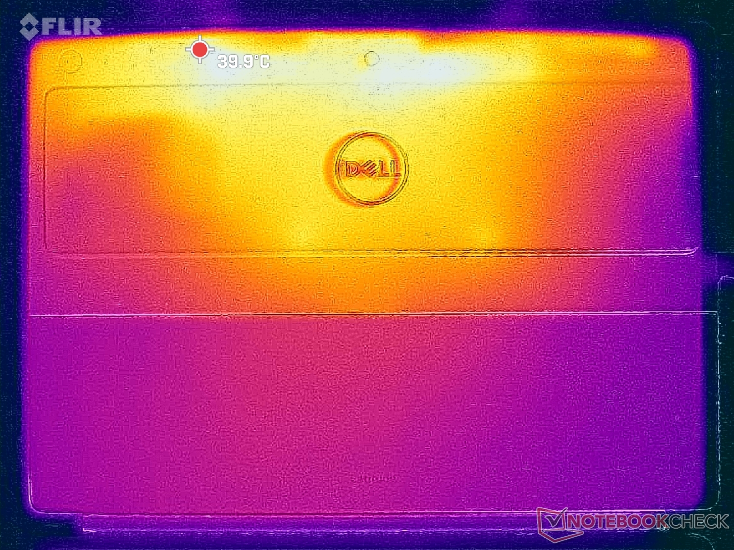 Das Latitude 7350 Detachable läuft deutlich kühler als das Surface Pro 9, was vermutlich an der effizienteren CPU, dem lauteren Lüfter und der etwas größeren Größe liegt. Die Wärmeentwicklung auf dem Tablet erreicht nur 39 °C auf der Vorderseite und 41 °C auf der Rückseite im Vergleich zu 46 °C beim Surface Pro 9. Auch die durchschnittlichen Oberflächentemperaturen sind mit nur 33 °C bzw. 10 °C kühler als beim Microsoft-Tablet. Die Handhabung des Dell-Geräts wird auch bei hoher Belastung nie unangenehm warm.