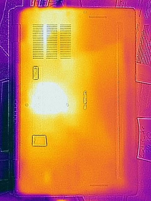 (+) Auf der Unterseite messen wir eine maximalen Wert von 38.7 °C (im Vergleich zum Durchschnitt von 36.8 °C).
