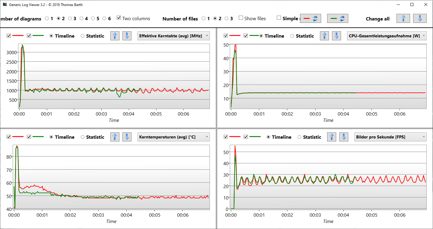 Bei der Ausführung von Prime95 zur Belastung der CPU stiegen die Taktraten für etwa 15 Sekunden auf 3,2 GHz an, bis eine Kerntemperatur von knapp 90 °C erreicht war. Danach fielen die Taktraten drastisch ab und stabilisierten sich bei 1,0 GHz. Der Dell Modus spielt dabei keine Rolle - was den CPU-Takt angeht. Lediglich für die iGPU ist erkennbar: Die fps in den ersten Sekunden steigen leicht an, statt 45 Watt darf sich das SoC sich für wenige Sekunden 50 Watt genehmigen.