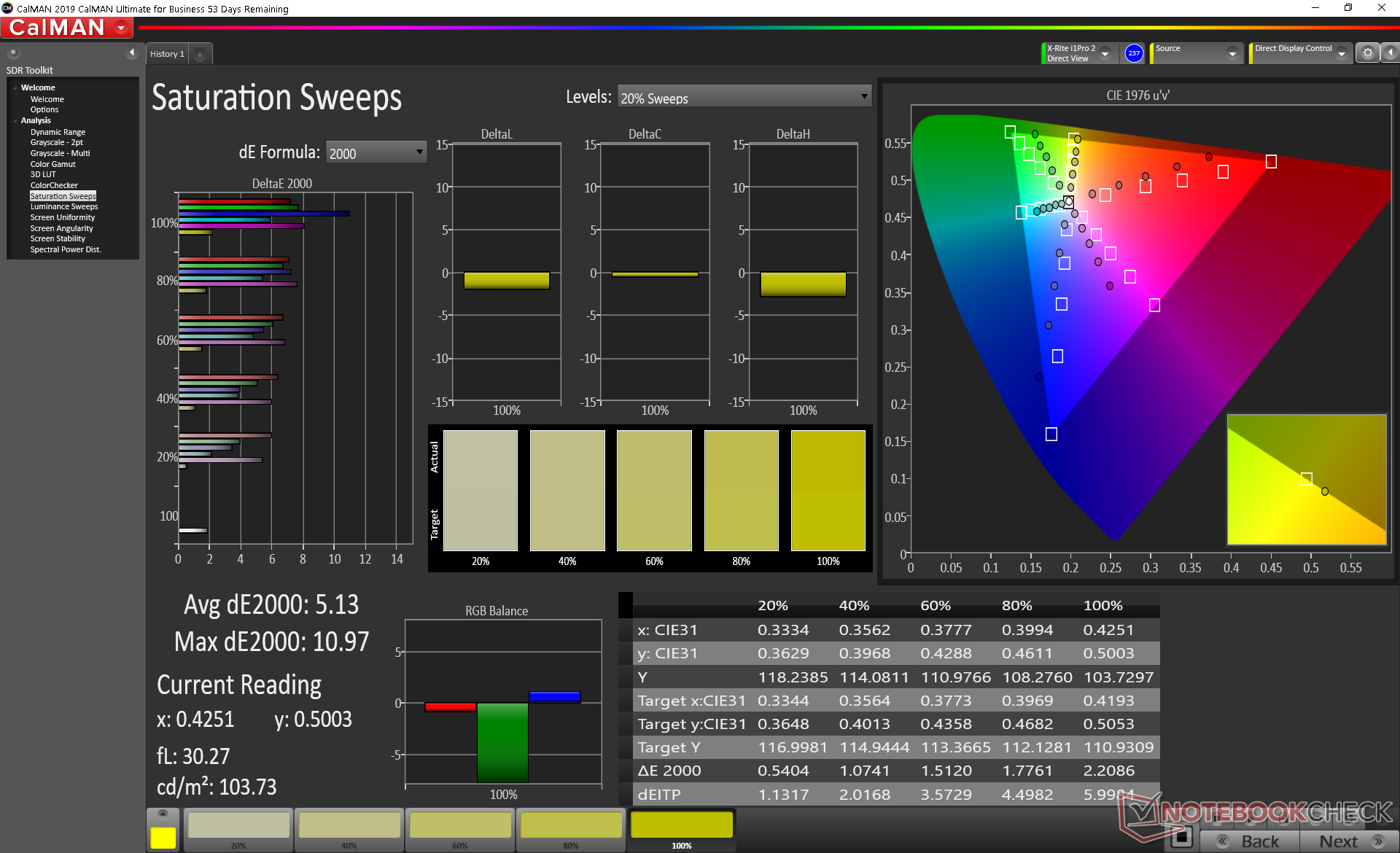 Die Anzeige ist dezent kalibriert, wobei die Farbtemperatur auf die kühle Seite tendiert. Unsere Kalibrierung behebt dies, aber die Farben bleiben aufgrund des oben erwähnten begrenzten Farbraums bestenfalls durchschnittlich.
