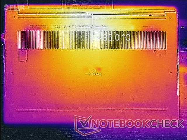 Die Oberflächentemperatur unter Last ähnelt der auf dem Precision 5550. Die Hotspots erreichen 49 °C (oben) bzw. 45 °C (unten). Die Temperatur verteilt sich aufgrund des symmetrischen Kühlsystems relativ gleichmäßig. Die Mitte der Tastatur ist deutlich wärmer als die Handballenablage und der äußere Rand. Das ThinkPad P15 Gen 2 ist eine stärkere mobile Workstation als unser Precision 5560, was allerdings auch zu deutlich wärmeren Hotspots von über 63 °C führt.